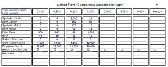 - Arômes naturels et artificiels à 0,1% de note prédominante artificielle : Les arômes qui ne contiennent pas plus de 0,1% de note prédominante artificielle sont considérés naturels lorsqu’ils sont utilisés dans des boissons alcoolisées. Le calcul de la quantité des constituants artificiels n’inclue pas la vanilline artificielle, l’éthylvanilline, le maltol artificiel, ni l’éthylmaltol.
