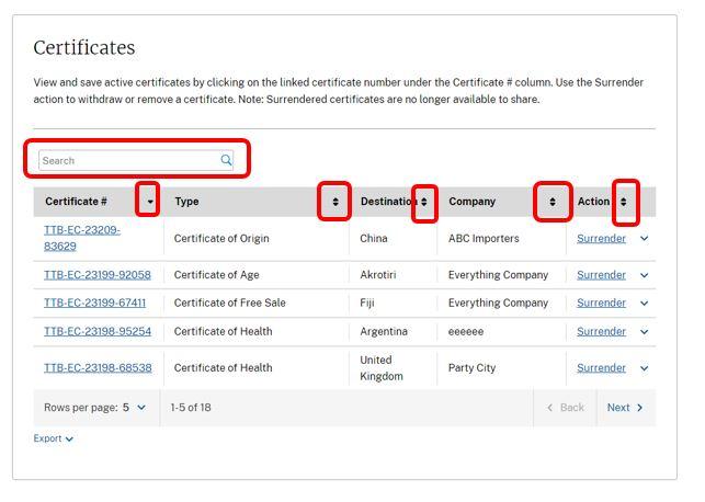 Searching your certificates. To search your database, use the arrows in the header of each column to sort the certificates in that category alphabetically (or numerically) by the information in that column. You may also use the search bar to type in a specific term that appears in one of the columns (e.g., a particular company) or in the expanded information panel of each certificate (e.g., a permit number). The search function only searches the information in the table, not the certificates themselves. For example, searching for a particular product described in the certificate will not produce any results.