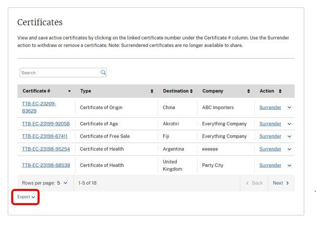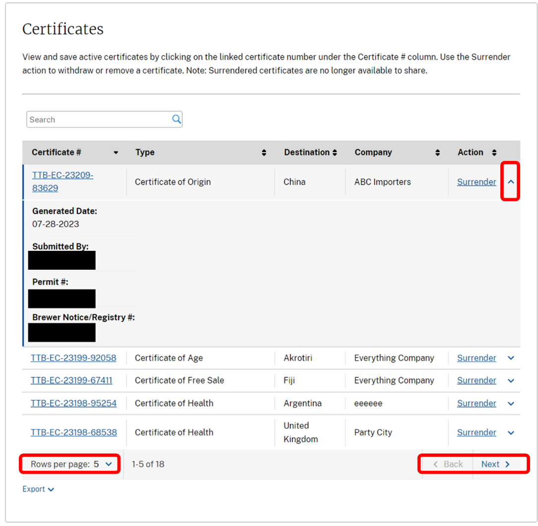 Viewing your database. To view your database, go to the Certificates section of the myTTB Export Certificate service main page. There is a table for all of the certificates you are authorized to view associated with the entity you are working on. Depending on how many certificates your entity has, and the size of your browser window, you may only be able to view a limited number of certificates at a time. You can change the number of certificates visible to you on a single page by selecting Rows per page and you can view additional pages by selecting Back or Next. Additionally, you can view more summary level information about a particular certificate by selecting the carrot in the row that certificate is listed in.