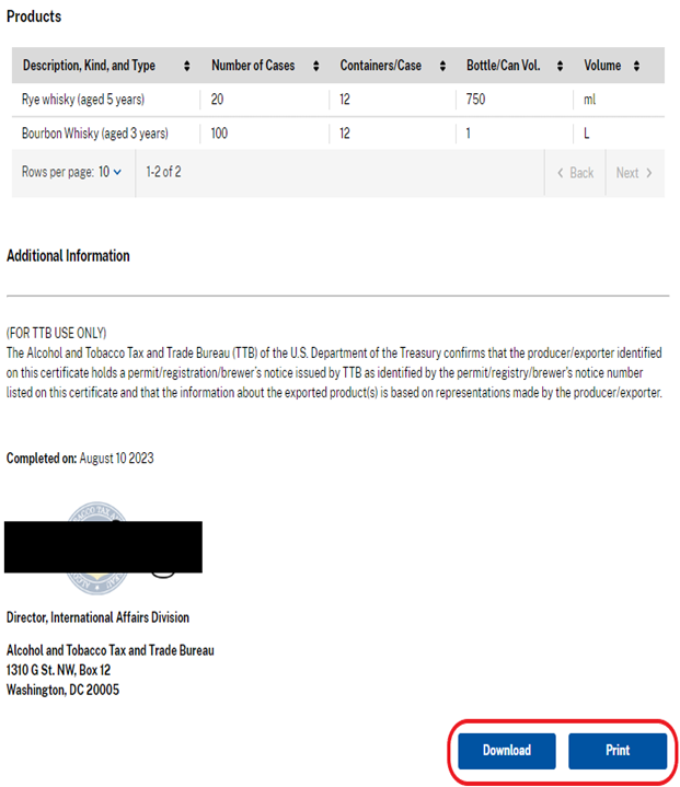 To create a PDF or paper version of your electronic export certificate as it appears on myTTB, select Print. This will allow you to print to a PDF or a printer.