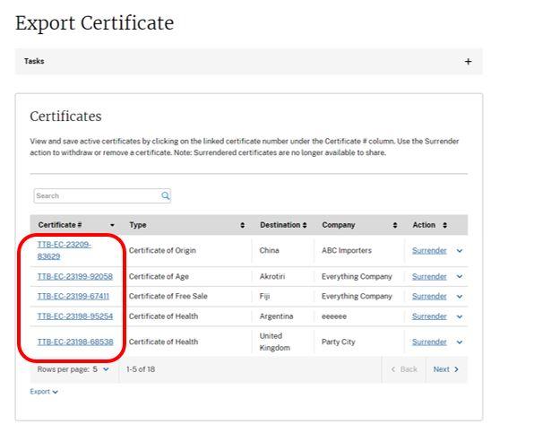 You may also access the export certificate PDF page later. To do so, select the Certificate number of the certificate you wish to share from the list of certificates on the Export Certificate main page.