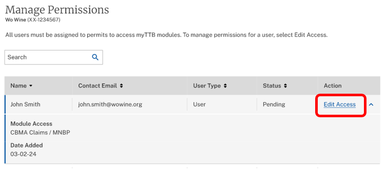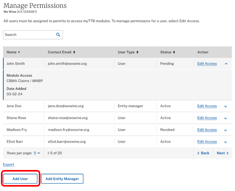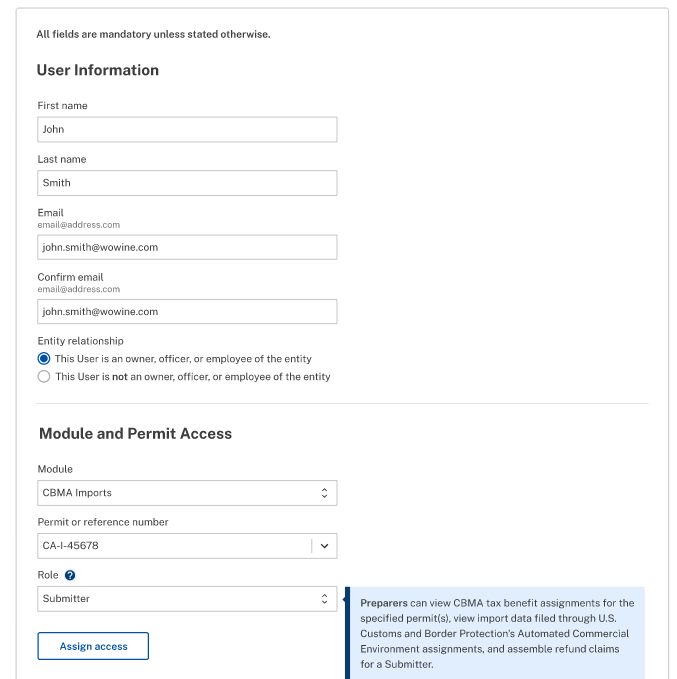 When adding users, Entity Managers must assign permissions to each user by selecting specific myTTB modules (such as the CBMA Importer Claims Module) and permits they should have access to. Entity Managers must also assign a role (such as “preparer” or “submitter”) to each user for a given permit and module.