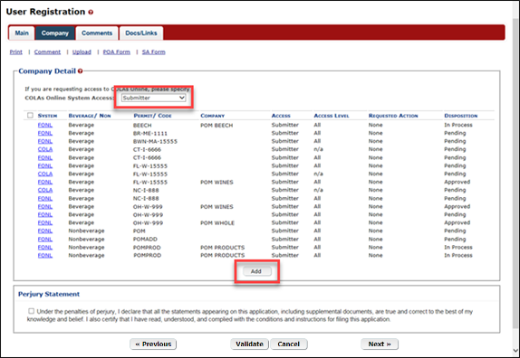 - Under “Company Detail,” select the type of access from the “COLAs Online System Access” drop-down list, then select “Add.”