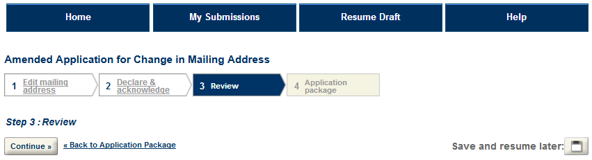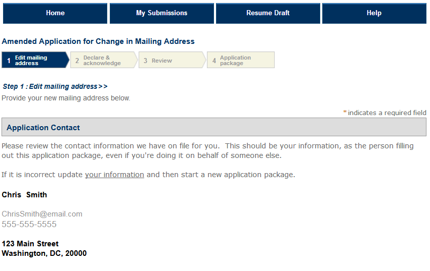 Note: Mailing address amendments are automatically approved upon submission. It may take up to 24 hours for these amendments to be reflected on your approval documents, but the amendments are considered approved when you receive the automated approval notification.