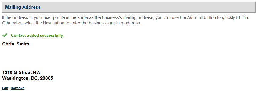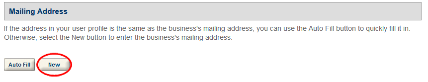 Note: In the Mailing Address section, select the "New" button and enter the new premises mailing address in the Contact Information box.