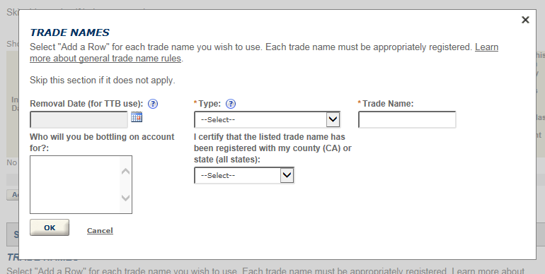 Trade names apply to all locations under the EIN. If you are bottling on account for someone else (contract bottling), you will be required to upload an authorization letter in Step 3.