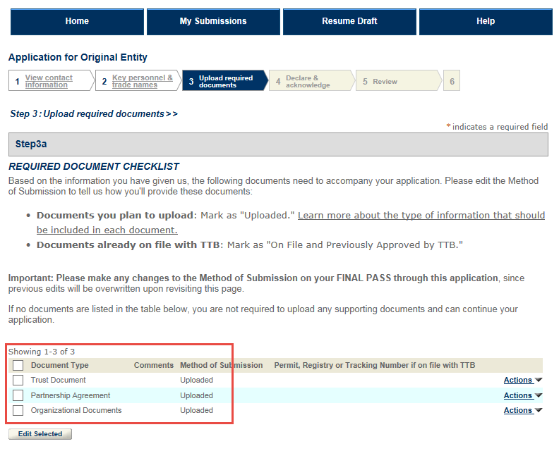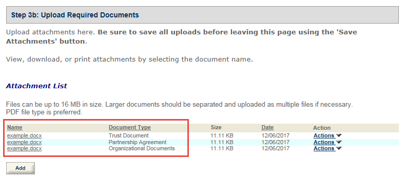Based on the answers you provided in the application, you will be provided with a list of documents in Step 3a that you will attach in Step 3b. Learn more about how to upload documents.
