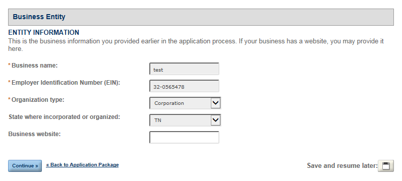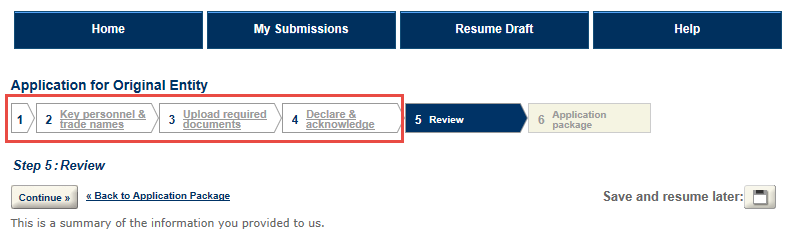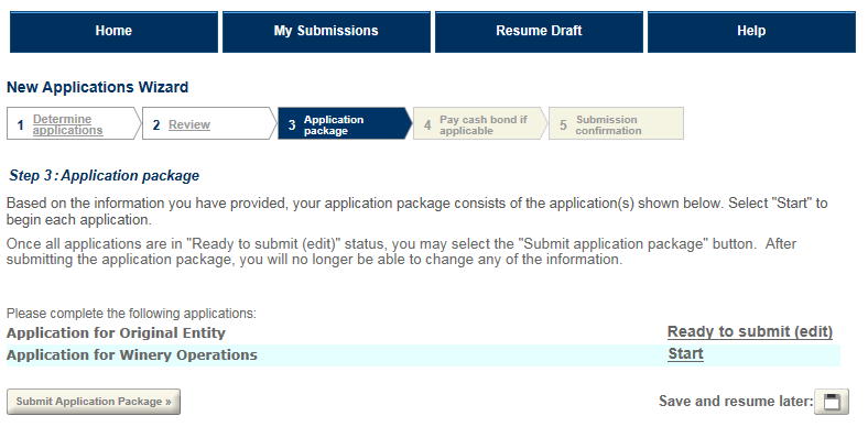 Step 6 will return you to the Application Package screen so you can complete other applications. Note that your Entity application is now in "Ready to submit (edit)" status. You can continue to make changes to all the applications within your package up until you submit.