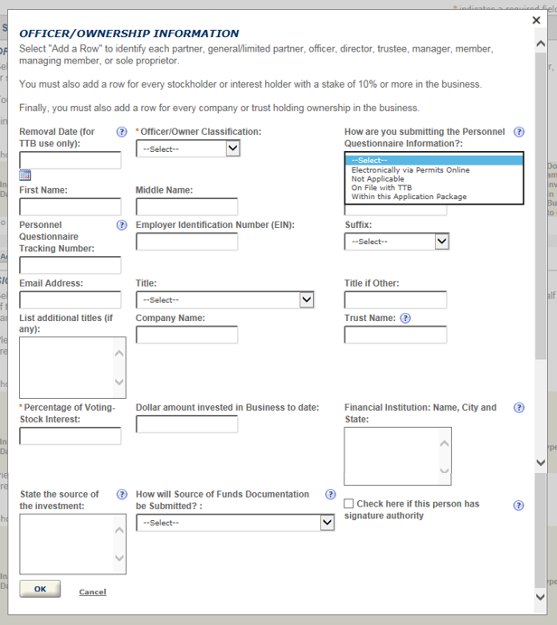 - "On File with TTB" if the PQ or OOI was filed separately via paper, through the mail.