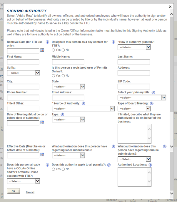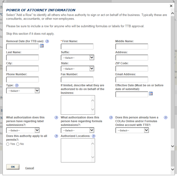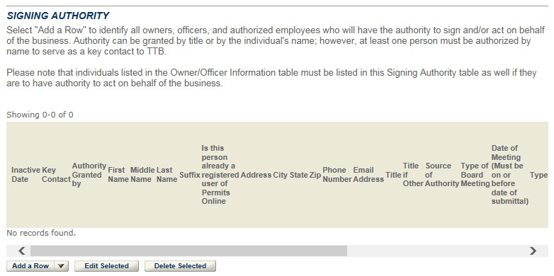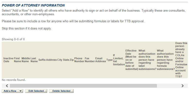 Anyone authorized to act on behalf of the business, including the person submitting the application package, must also be entered into either the Signing Authority or Power of Attorney table. Evidence of each person's Power of Attorney must be documented using TTB F 5000.8, then attached in Step 3.