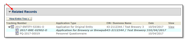 Locate and select the applicable entity tracking number from the "My Records" list and scroll down to the "Related Records" section. You can expand the section to view the associated records by clicking on the arrow. In this example, this entity has a brewer's notice associated with it, as well as a Personnel Questionnaire.