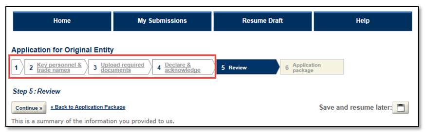 To go to a previous screen for editing or review, simply select the appropriate step from the Step Indicator bar. Your browser may ask if you really want to leave the page you are on – if you have not already done so, we recommend that you save your work (using "Save and resume later") before proceeding. Learn more about saving and resuming applications.