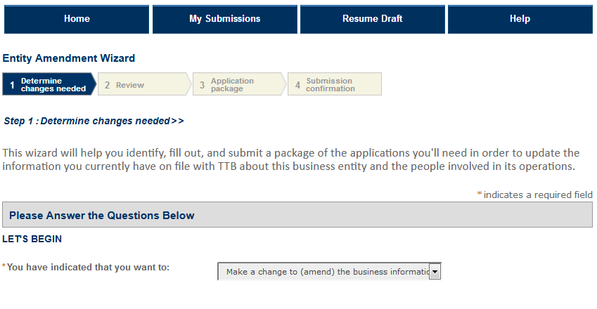 The entity record contains the information specific to the business entity that is conducting TTB-regulated commodity operations. To report changes, you must start by completing the questions in the Amendment Wizard.