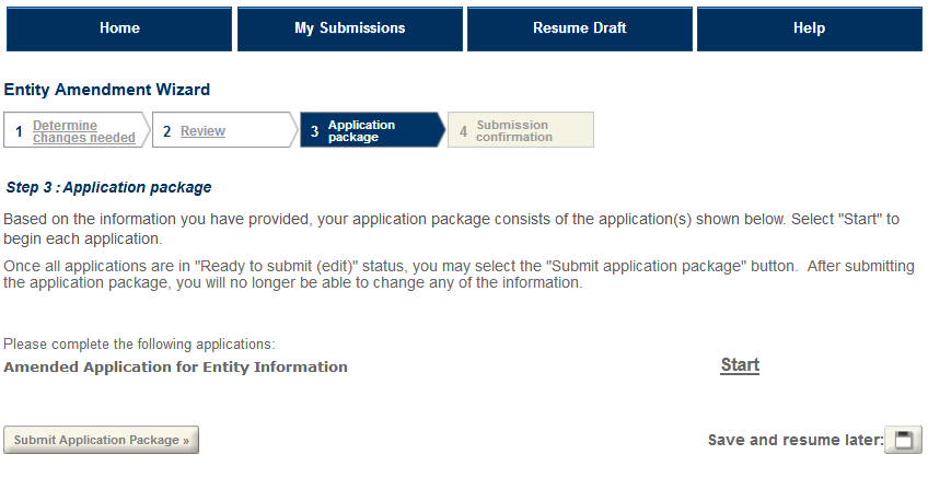 From here select "Start" to open and complete the Amended Application for Entity Information.