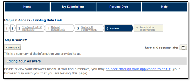Review the information you provided. You may go back and edit information by selecting the applicable step indicator button. If all is correct, select the "Continue" button.