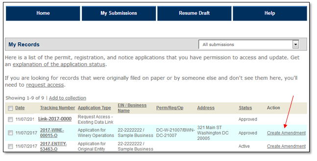 Once your request is approved, you can find the records you've been given access to on the "My Submissions" page. You will then be able to file amendments to these permits, registrations, or notices electronically through Permits Online.