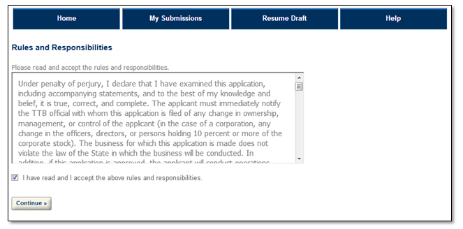 Indicate that you have read and accept the Rules and Responsibilities by marking the box. Select the "Continue" button.