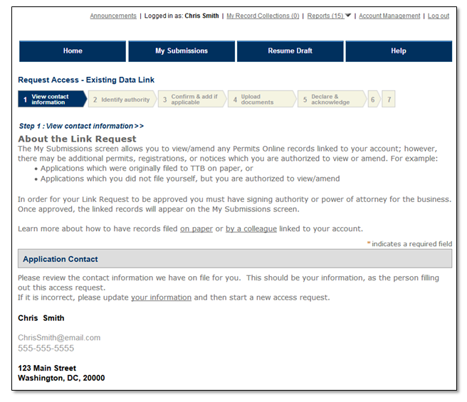 The application contact information shown is your information. You cannot request access for someone else. TTB will contact the application contact if we have questions about the request.