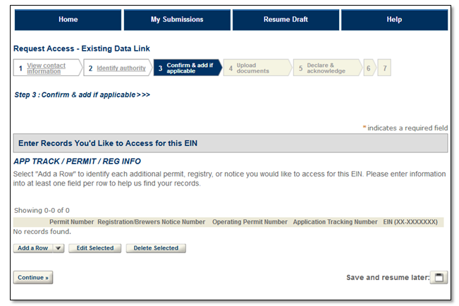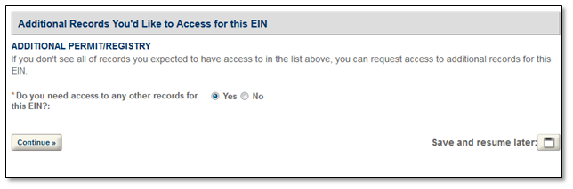 If you do not see a record you are looking for, answer "Yes" to the question "Do you need access to any other records for this EIN?" Select the "Continue" button.