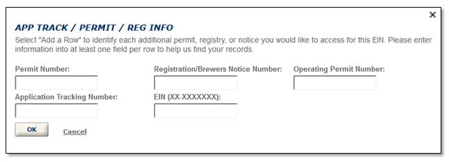 Select "Add a row" to identify each additional permit, registration, notice you wish to access to for this EIN.