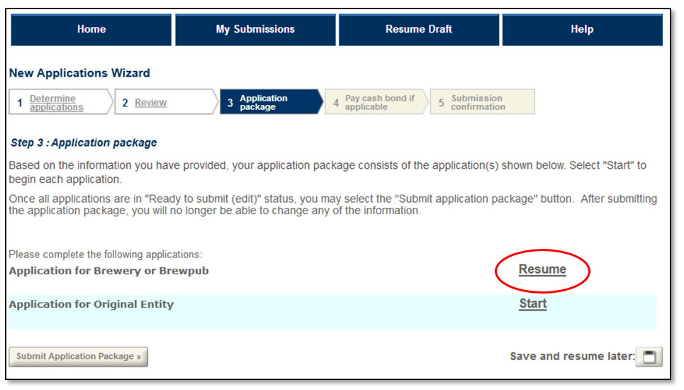 If you are working on an application within an application package, when you select "Save and Resume Later" you will be taken to the "Application package" screen; you can now safely log off without losing your work. When you select "Resume" you will be taken to step 1 of the application. Use the "Continue" buttons at the bottom of each page to get to the step where you need to resume working on the application.