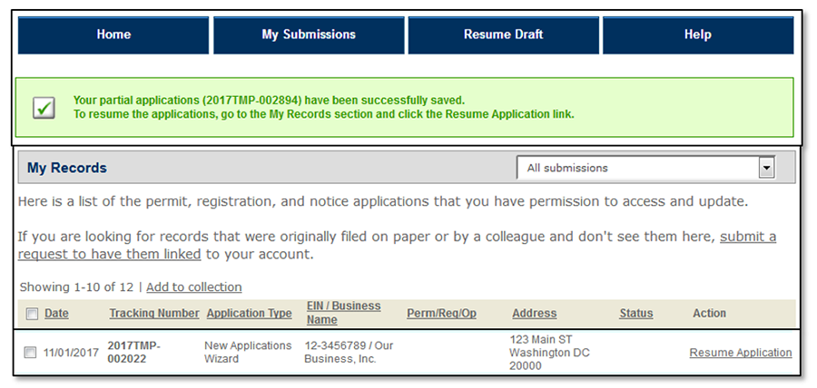 If you are working on an application or request that is not part of an application package, when you select "Save and resume later" you will be taken to your "My Submissions" page where you will see confirmation that your partial application has been saved. Saved applications are assigned a temporary tracking number in the "My Records" section. In the "Action" column of the "My Records" table select "Resume Application."
