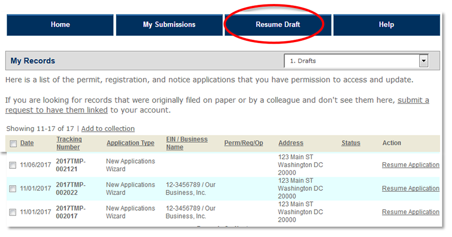 You may also resume saved applications by using the "Resume Draft" button at the top of each page. After selecting "Resume Draft" you will see a list of all your temporary records. Select the one you wish to resume.