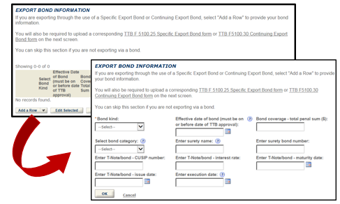 Export Bond Information - Select only if you will be exporting product through the use of an Export Bond