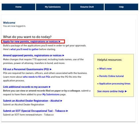 Note: This page contains instructions and screenshots so you can see what to expect when using Permits Online, our online method of applying for a TTB permit, registration, or notice.