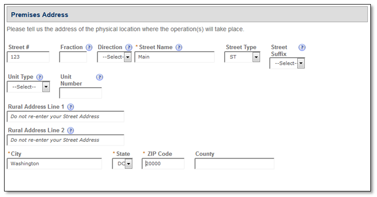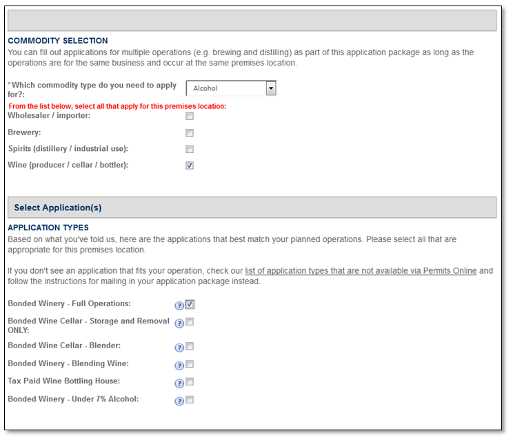 Commodity selection and application type: Select your commodity. Based on that, a list of possible application types will appear; select all that are applicable based on the type of TTB-regulated business you plan to conduct at this premises.