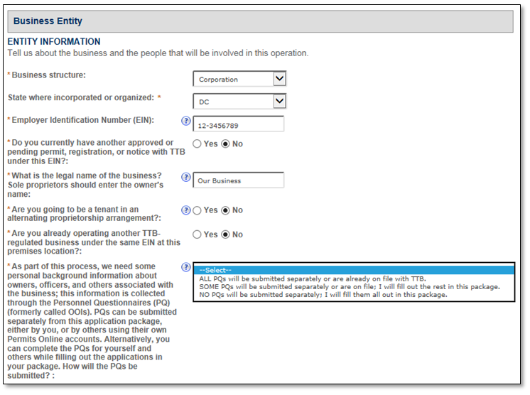 - Application for Original Entity - Gathers information about the business that will be conducting the commodity operation(s). If the application package is for a business that holds other permits/registrations/notices with TTB, you will: