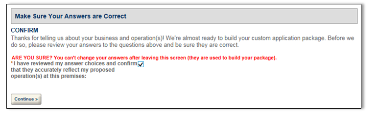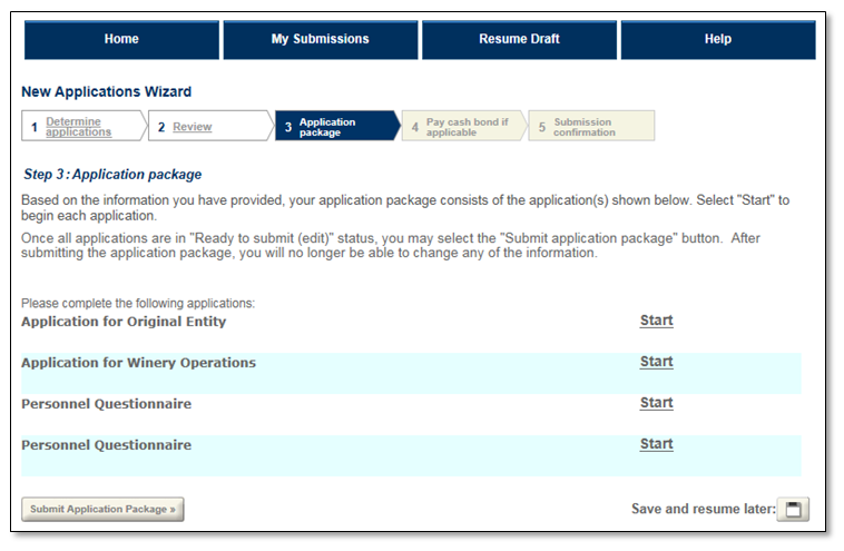 To start, you'll be asked a short series of questions. Based on your answers, the wizard then creates a custom package of one or more applications. Once you've completed all of the applications, submit the entire package to TTB for processing.