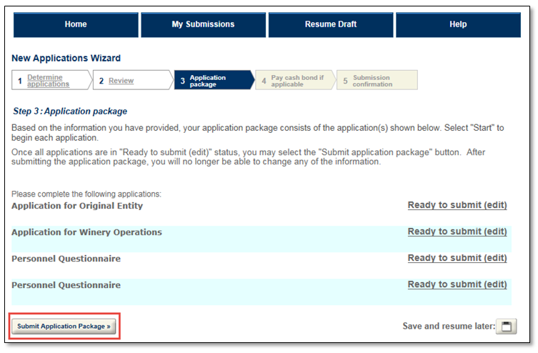 Submit your application package. As you complete each application in the package, its status will change to "Ready to submit (edit)." Once you have filled out all the applications in your package, select "Submit Application Package" to send all your applications to TTB for review and approval.