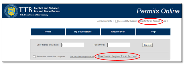 You can register for a Permits Online account by clicking on "Register for an Account" at the top of the screen or "New User: Register for an Account" under the login information.