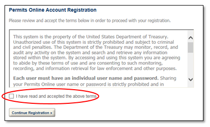 Account Registration: Accept the terms and select "Continue Registration."