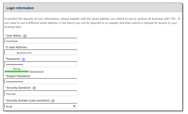 Login Information: Enter your user name, email address, password, secuity question and answer