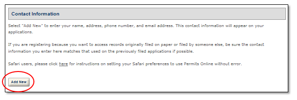 Contact Information: Click "Add New" to enter your contact information