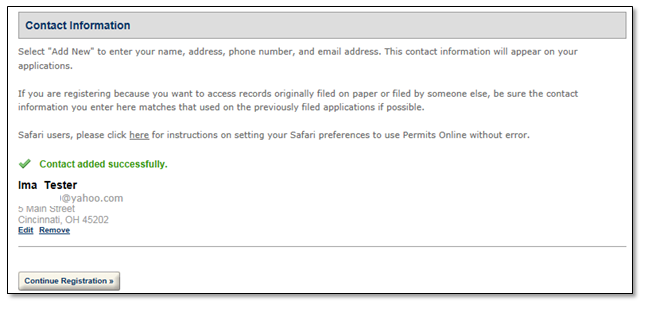 Contact Information: Review your information and click "Continue Registration"