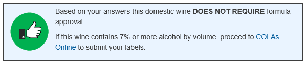 If the result is that a particular wine does not require formula approval you’ll see the green “thumbs up” and you can proceed directly to submitting the labels to TTB (if required).