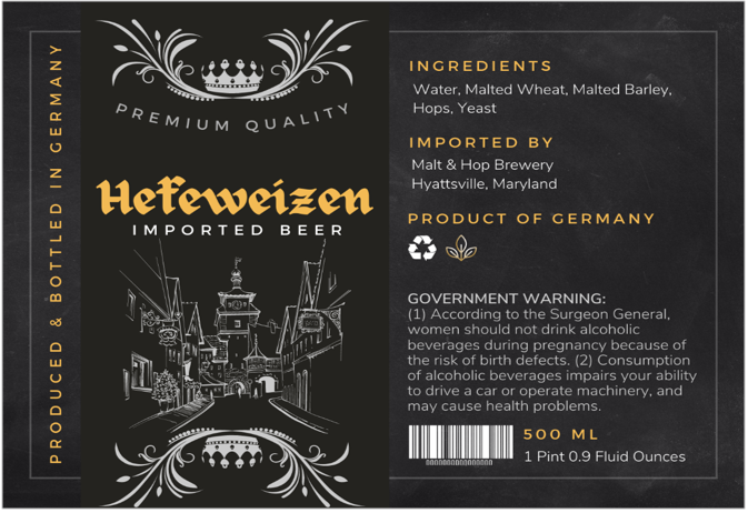 On the label above, “Imported By: Malt & Hop Brewery, Hyattsville, MD” is the importer’s name and address statement, and the label’s country of origin statement is “Product of Germany.”